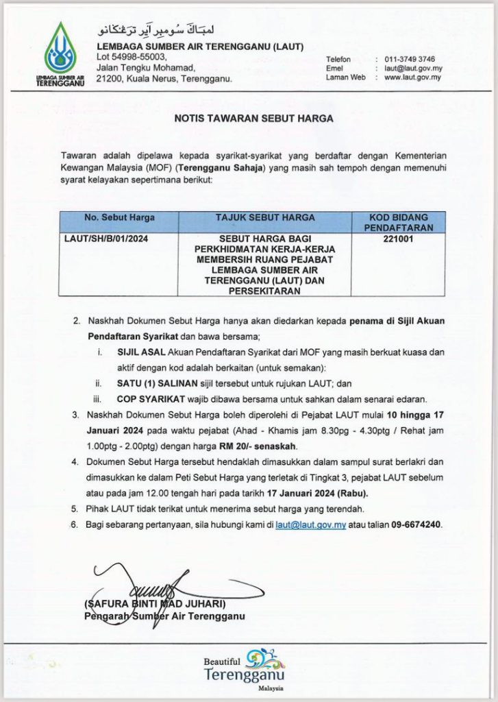 Naskhah Dokumen Sebut Harga boleh diperolehi di Pejabat LAUT dengan harga RM 20/-senaskhah;